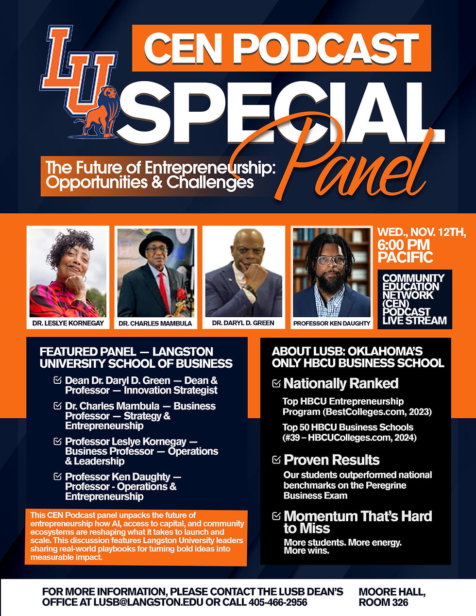 The Langston University School of Business is poised to make a meaningful impact in a panel discussion on the Community Education Network (CEN) Podcast, tackling the pivotal topic of 'The Future of Entrepreneurship: Opportunities & Challenges.' This special episode brings together our distinguished faculty members - Dr. Charles Mambula, Dr. Leslye Kornegay, Professor Ken Daughty, and Dr. Daryl Green - to delve into innovation, access to capital, and the evolving entrepreneurial landscape. The Community Education Network (CEN) is dedicated to elevating the human experience by showcasing visionary leaders from diverse backgrounds who share expertise that fosters progress and understanding.